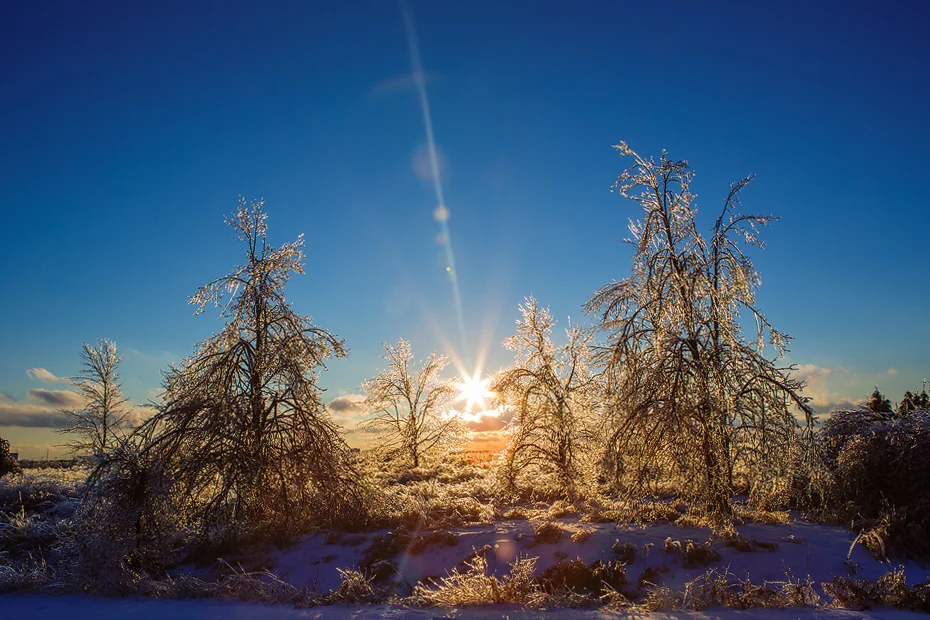 Sun peers through ice covered trees at Claireville Conservation Area in Brampton, Ontario.