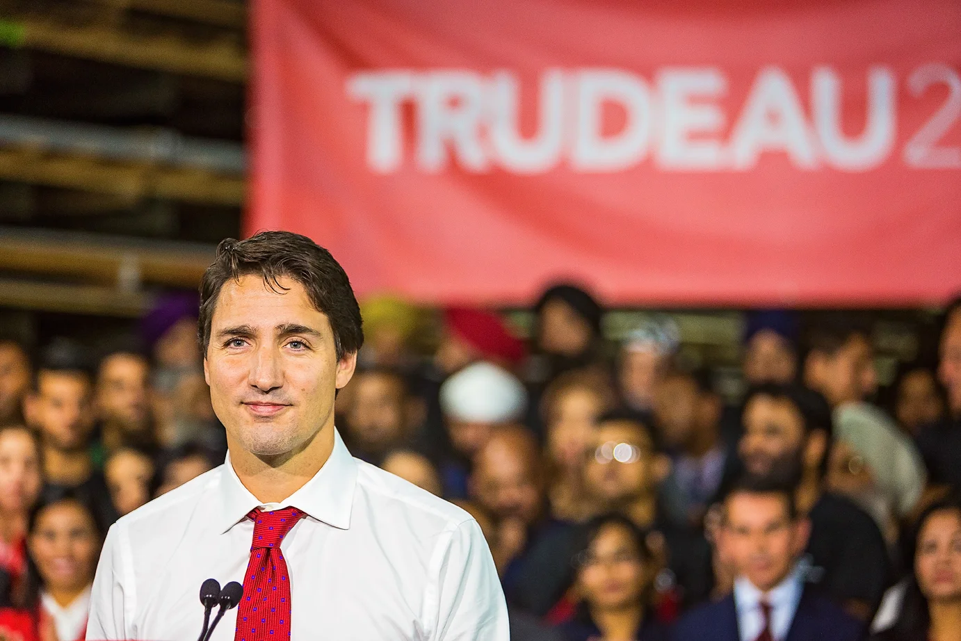 Justin Trudeau acknowledges and appreciates the crowd of supporters at a steel manufacturing facility during his Trudeau2015 election campaign.